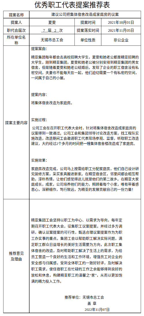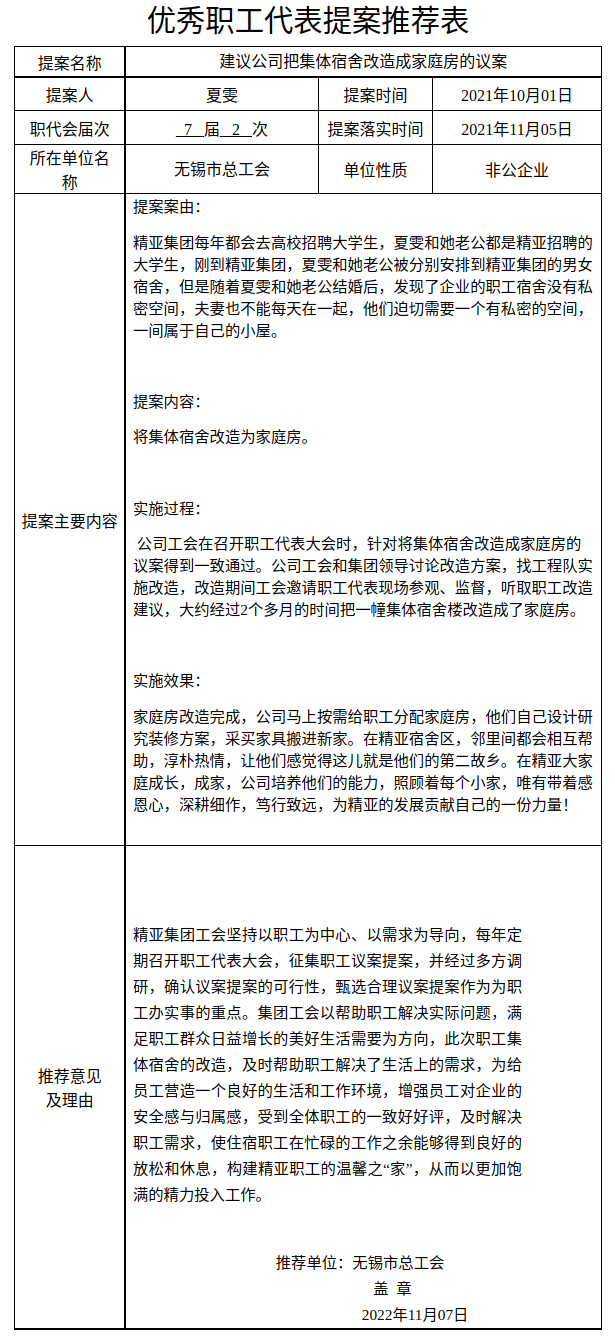 建议公司把集体宿舍改造成家庭房的议案