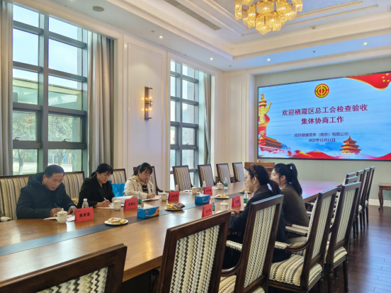 戴老师与王老师听取了马群街道总工会关于2025年全年工作及2026年集体协商工作思路的汇报,并依次走访南京恒电电子有限公司、江苏冠亚建设工程有限公司、纽好健康营养(南京)有限公司、南京金豹器具运动实业有限公司4家单位,开展2025年度集体协商检查验收工作。相关单位就集体协商工作进行了认真汇报,戴老师通过解读集体协商条例,指导企业开展集体协商和能级协商,并在现场开展集体协商工作知晓度、满意度测评。